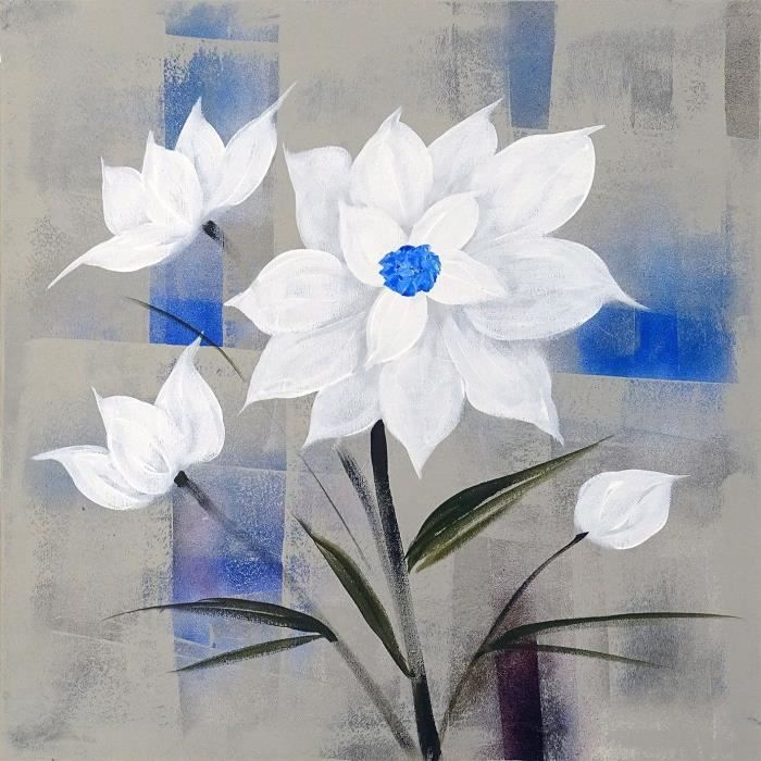 FLEURS BLANCHES Toile peinte 70x70 cm Blanc, bleu et noir - Achat / Vente tableau - toile - Cdiscount